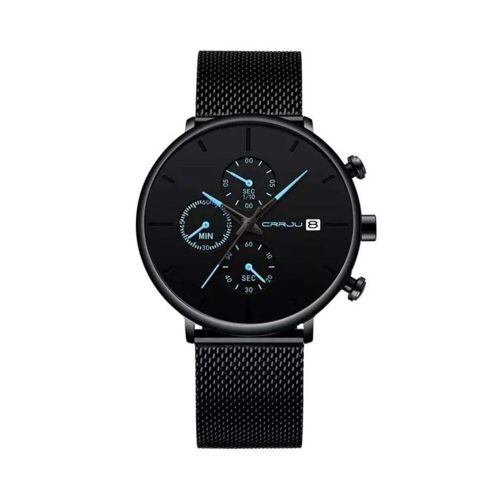 CRRJU 2268 Luxury Black Mesh Steel Band Chronograph Casual Fashion Men’s Watch powered by Japanese quartz movement provide accurate timing of the watch. Casual and Fashion Cool Style Men’s Watch is designed for modern man who pursue vitality, individuality, and classic but minimal fashion. Top-quality Mesh Stainless Steel creative fashion men’s watch not only to enhance wearing comfort but also to offer bold aesthetics and minimalism. The CRRJU 2258 Men's watch seamlessly transitions from casual daytime wear to elegant evening attire and is designed for the modern and stylish man. It is the perfect addition to any men's wristwatch collection.