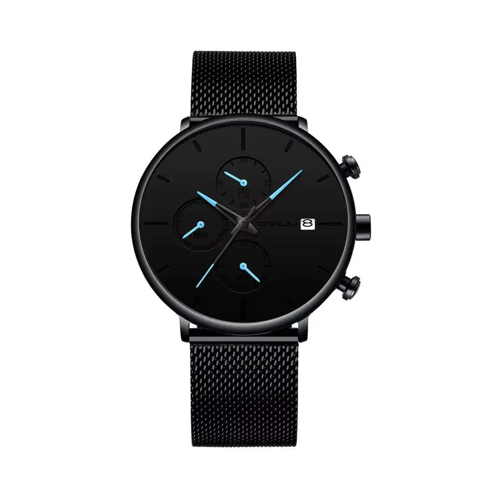 CRRJU 2268 Luxury Black Mesh Steel Band Chronograph Casual Fashion Men’s Watch powered by Japanese quartz movement provide accurate timing of the watch. Casual and Fashion Cool Style Men’s Watch is designed for modern man who pursue vitality, individuality, and classic but minimal fashion. Top-quality Mesh Stainless Steel creative fashion men’s watch not only to enhance wearing comfort but also to offer bold aesthetics and minimalism. The CRRJU 2258 Men's watch seamlessly transitions from casual daytime wear to elegant evening attire and is designed for the modern and stylish man. It is the perfect addition to any men's wristwatch collection.