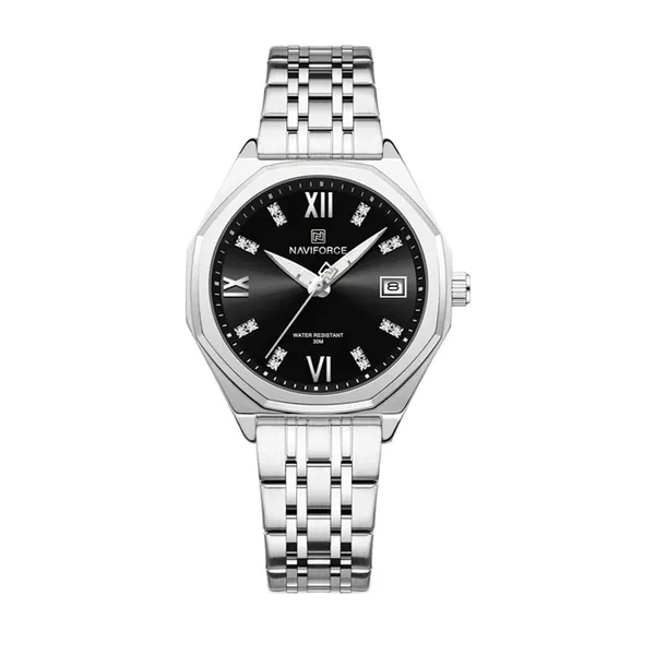 Naviforce 5052 Luxury Stainless Steel Quartz Analog Men's Watch – Dial Color: Black, Strap Color: Silver – View 1