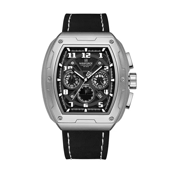 Naviforce 8053 High Quality Genuine Leather Straps Chronograph Men's Watch – Dial Color: Silver, Strap Color: Black – View 1