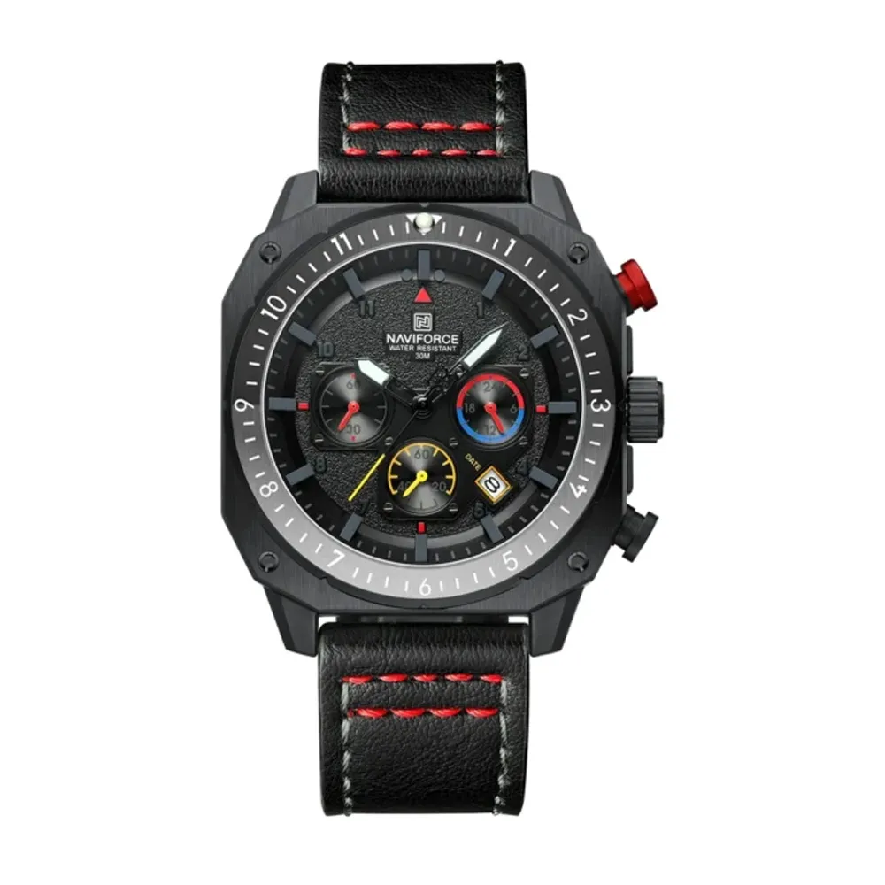 Naviforce 8057 High Quality Genuine Leather Straps Chronograph Men's Watch – Dial Color: Black, Strap Color: Black – View 1