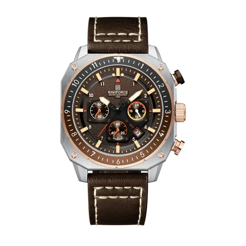 Naviforce 8057 Luxury Genuine Leather Straps Chronograph Sports Men's Watch has both Quartz Movement, equipped with a creative calendar display ideal for modern men who pursue vitality, individuality, classness, and fashion. High quality genuine leather strap creative fashion men’s watch not only to enhance wearing comfort but also to offer bold aesthetics and hardcore temperament. The Naviforce 8057 Men's watch seamlessly transitions from casual daytime wear to elegant evening attire and is designed for the modern and stylish man. It is the perfect addition to any men's wristwatch collection. The Naviforce 8057 wristwatch comes with a Unique Round-shaped Alloy Case and Hardlex crystal glass, presenting a visually stunning and classy but trendy outlook. With Case thickness of 14.5mm, band width of 24mm, band length of 26.5cm, and dial diameter of 49mm the watch ensures fit and comfort for any man’s wrist. Moreover, The Naviforce 8057 watch offers features like Water resistance, Week display, luminous hands, Shock resistance, and diverse color options at a very affordable price is just what every man needs