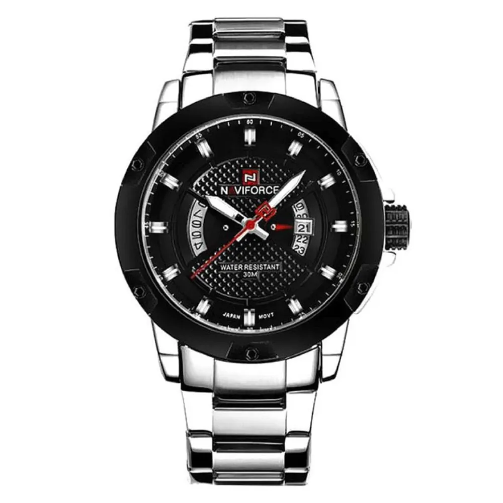 Naviforce 9085 Water Resistant Stainless Steel Quartz Men's Watch – Dial Color: Black, Strap Color: Silver – View 1