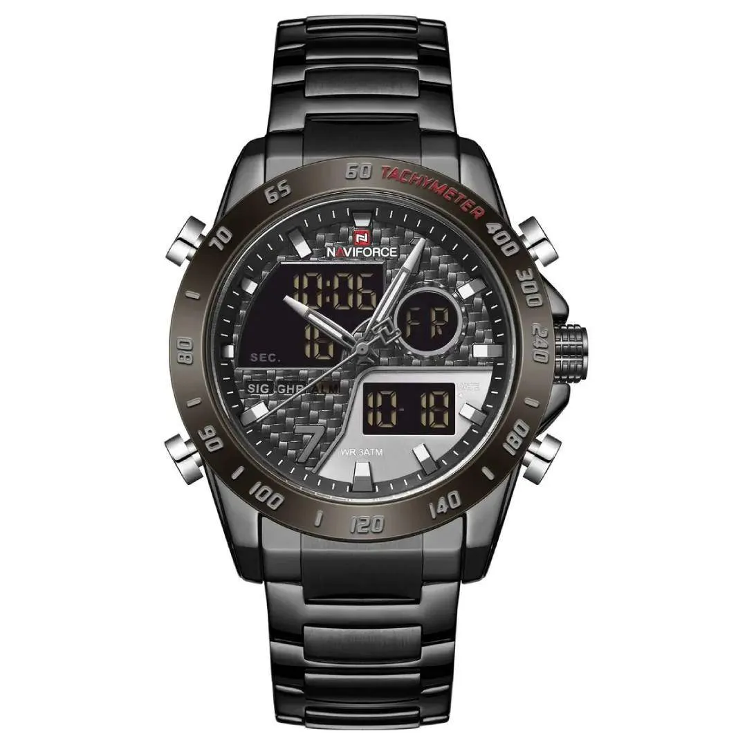 The Naviforce 9171 CH Men's Watch is a stylish and strong wristwatch made for men who like bold look and useful features together. This watch mix both analog and digital display, so you get classic look with modern touch. The round case made from solid alloy material, give it strong body that look very premium on hand. The glass is clear and protect inside from dust and small scratch. The strap made from soft leather, easy to wear for long time without feel heavy. You can wear it for daily use, office, travel or outing, it fit all place nicely. The watch show time very accurate, thanks to quartz movement inside. You also get digital screen that show date, week, and alarm option, very useful for daily routine. Its dual display design make it more unique, look smart and elegant on wrist. It also water resistant for small splash or rain, so you can wear worry free in normal day. This Naviforce 9171 CH give both look and performance in one watch that match your lifestyle perfectly.