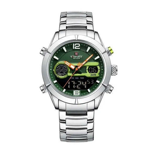 Naviforce 9232 Stainless Steel Dual Movement Luxury Fashion Men's Watch has both Analog and digital movement, equipped with a creative calendar display ideal for modern men who pursue vitality, individuality and classic but sports fashion. High quality stainless steel strap fashion men’s watch not only to enhance wearing comfort but also to offer bold aesthetics and hardcore temperament. The Naviforce 9232 Men's watch seamlessly transitions from casual daytime wear to elegant evening attire and is designed for the modern and stylish man. It is the perfect addition to any men's wristwatch collection.
