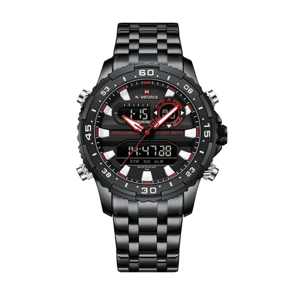 Naviforce 9234 High Quality Stainless Steel Dual Movement Sport Fashion Men Watch – Dial Color: Black, Strap Color: Black – View 1