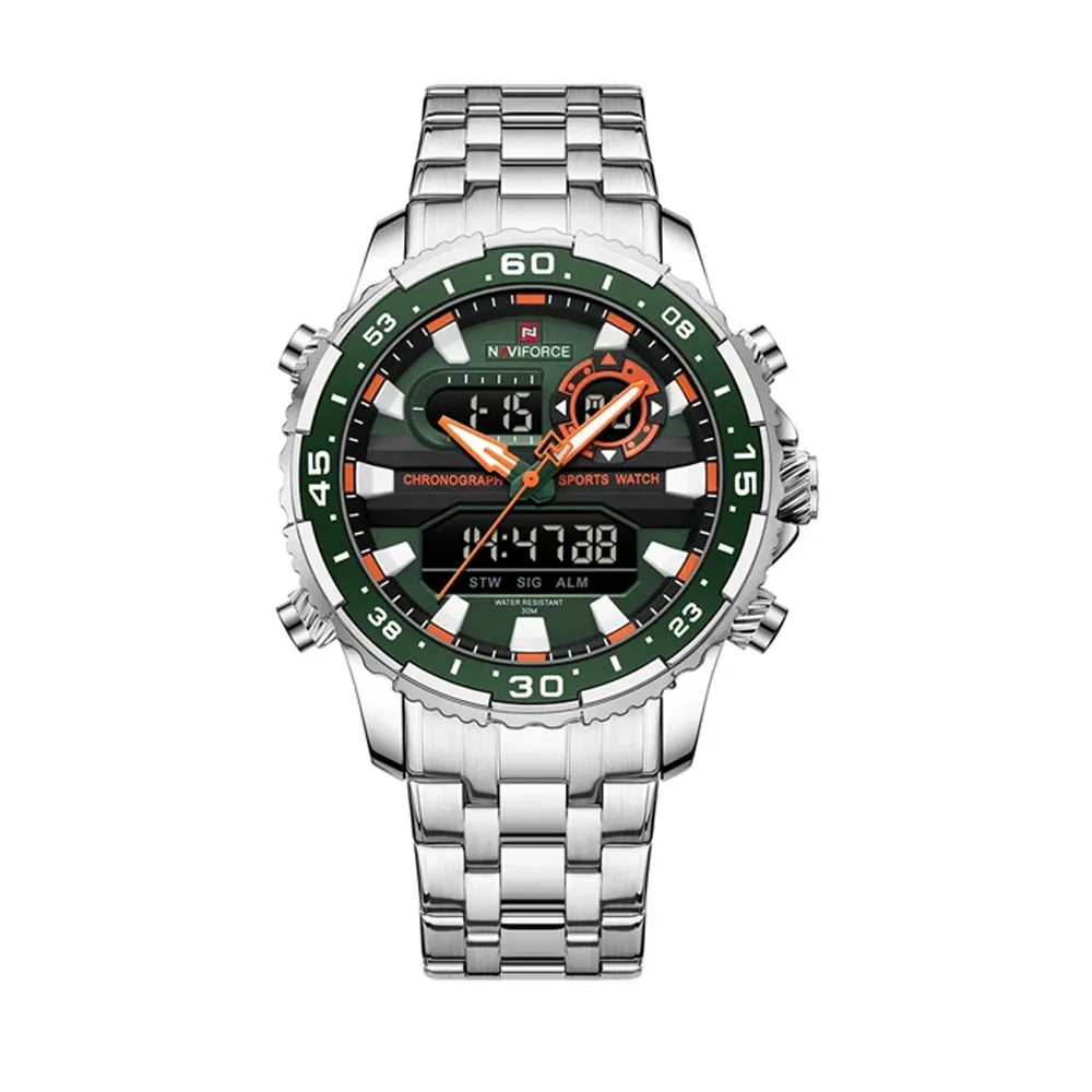 Naviforce 9234 High Quality Stainless Steel Dual Movement Sport Fashion Men Watch – Dial Color: Green, Strap Color: Silver – View 1
