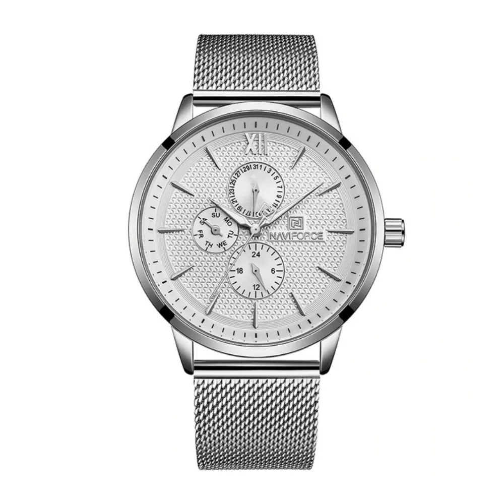 Naviforce NF3003 Mesh Stainless Steel Quartz Men's Watch – Dial Color: Silver, Strap Color: Silver – View 1