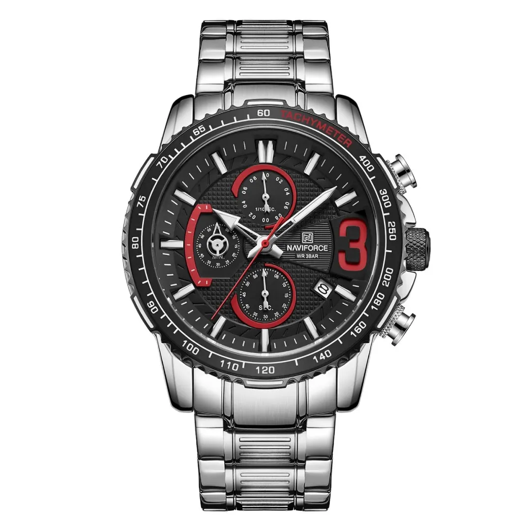 NAVIFORCE NF8017 Multifunction Stainless Steel Quartz Men's Watch – Dial Color: Black, Strap Color: Silver – View 1