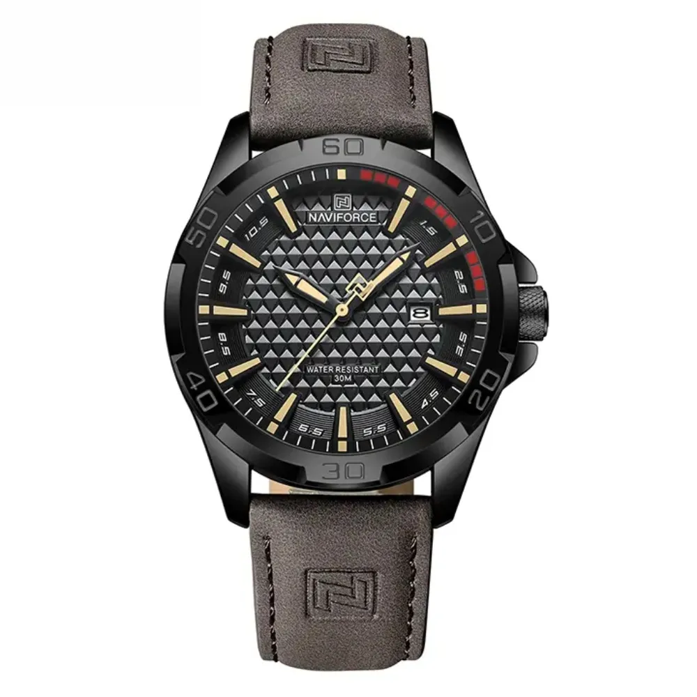 NAVIFORCE NF8023 Luxury Military Leather Sport Quartz Men’s Watch is made for men who want a strong stylish and useful watch all together. The design looks bold and smart, it feels premium in hand and gives a real military sporty vibe. Case is made solid and durable so it does not break or scratch easily. The leather strap is soft on wrist, so you can wear it for a long time without feeling pain. It combines both modern fashion and a tough outdoor look, good for people who want style but also want a long-lasting watch. The dial is clear and easy to read; numbers and markers are sharp so you can see even in a quick look. Inside it runs by quartz movement; that means timekeeping is accurate and steady. You can use this watch in the office, on outing, sport or travel, it matches with all. It is not just for showing time. This watch is also a fashion piece that makes your personality strong. Strap color and dial both look luxury, give premium feel in any dress. People who like sporty and military-type looks will find this watch perfect. NAVIFORCE always make watches with quality, and this NF8023 model is one of the best in their collection. If you want one watch that look smart, run long, and stay comfortable, this watch is the right choice.