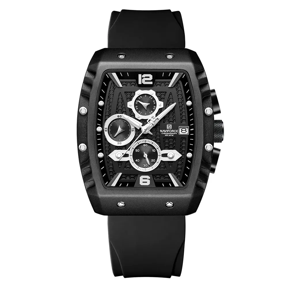 Naviforce NF8025 Quartz Silicone Chronograph Sports Men’s Watch is a stylish but also very useful watch made for men who like sporty design and also want strong performance. The look is modern, with a bold case and a nice finish that catches the eye quickly. It comes with silicone strap which is soft on the hand and also durable for long wear. Even if you wear it all day at work, at the gym, or outside, it not make your hand feel heavy or sweaty. The build quality is solid, with a strong body and glass that not scratch easily in daily use. Inside it runs with Quartz movement, so time is always accurate, with no delay problem. The chronograph function also give you more than just normal time; you can use stopwatch style for sports or timing activity. It show hours, minutes, seconds with clear dial that easy to read day or night. The design mix casual and sporty, so you can wear with t shirt, jeans or even with little formal also look nice. Water resistance also there, so no problem in light rain or sweat. This watch made for men who want one watch for all occasion, office, travel, gym or outside hangout. It give both good style and real function, not just for look but also for everyday use.