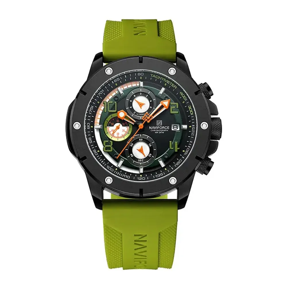 NAVIFORCE NF8034 Chronograph Men's Watch is a stylish men’s wristwatch made for people who like both fashion and function together. The design is bold and modern, so when you wear it, it gives a smart look in hand. The watch has chronograph function, so you can track time in many ways, not only by hour and minute but also by seconds and stopwatch style. It is built with a strong body and good material, so it can last long even if you use it every day. The strap is comfortable and fits well, so you can wear it in the office, at a party or casual time also. Dial is clean but detailed, showing you multiple pieces of info on one screen. The watch is waterproof, so no worry about rain splashes or washing hands. It balances both style and utility, so people use it for fashion and also serious timekeeping. This NAVIFORCE model is especially liked by the young generation who want a tough-looking watch. It is also good for gift, because it comes with premium design and quality. If you want a watch that covers daily needs, sport use, and smart appearance at the same time, this NF8034 is the right option.