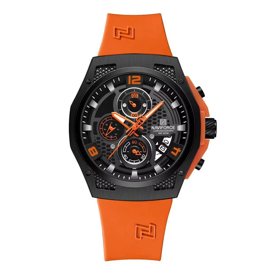 NAVIFORCE NF8051T Luxury Silicone Band Quartz Men's Watch – Dial Color: Black, Strap Color: Orange – View 1