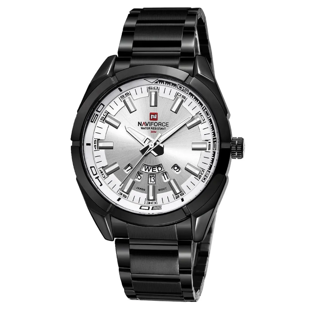 Naviforce NF9038 Luxury Quartz Stailness Steel Men's Watch – Dial Color: Silver, Strap Color: Black – View 1