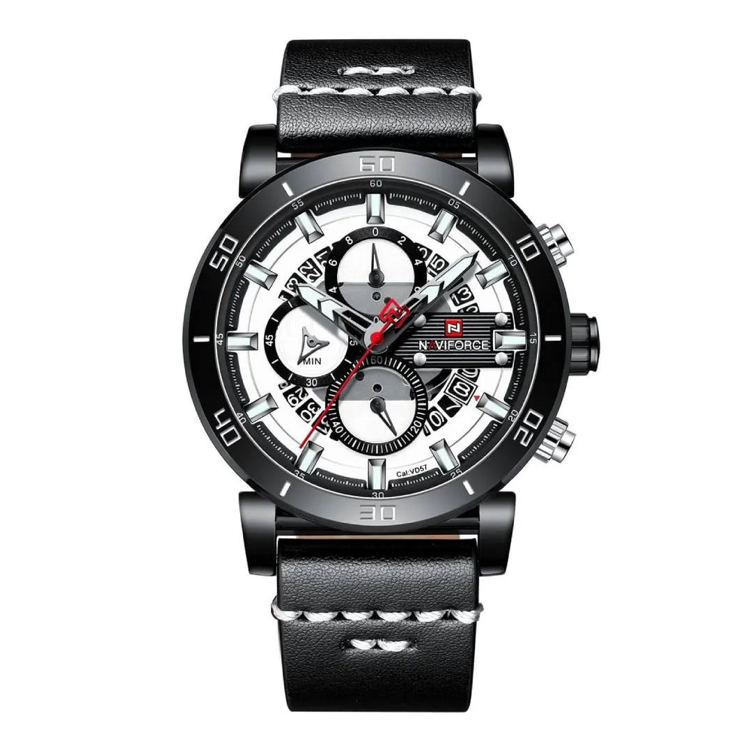 Naviforce NF9131 Analog Sports Leather Quartz Men's Watch – Dial Color: White, Strap Color: Black – View 1