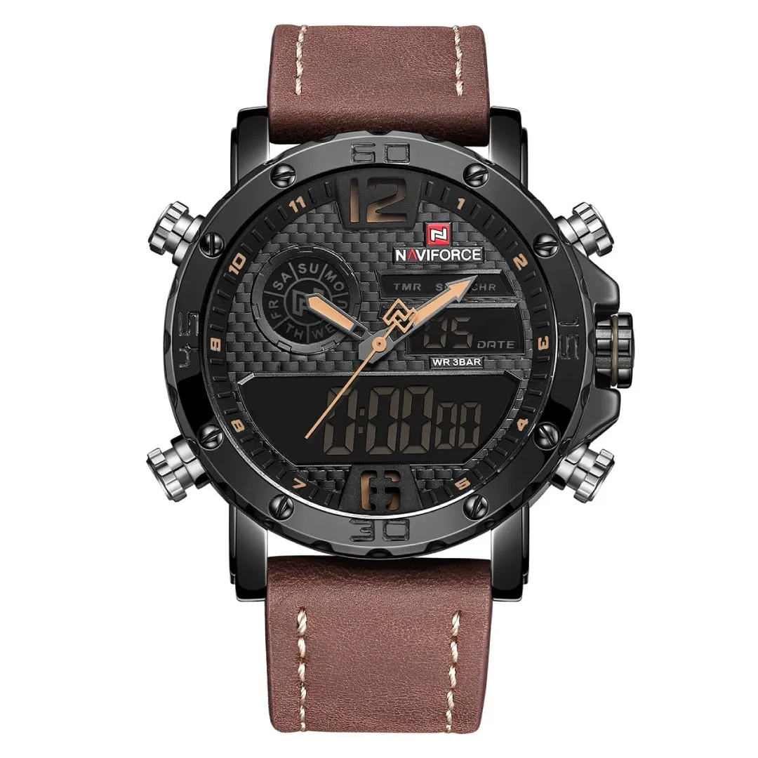 NAVIFORCE NF9134 PU Leather Analog Digital Sports Men's Watch – Dial Color: Black, Strap Color:  Brown  – View 1