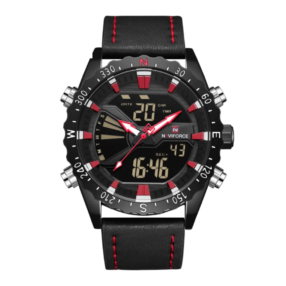 NAVIFORCE NF9136 Military Sports Quartz Analog Digital Men’s Watch is a stylish and tough wristwatch made for men who like sporty design but also need something useful in daily life. The watch comes with both analog and digital displays, so you get a double option to check the time. Body look solid and manly, fit for casual use, office, or outdoor. The strap is comfortable and not too heavy, so you can wear it for a long time without feeling a problem. Case design gives a bold look, and it also shows the date, alarm, and other basic functions that help in daily routines. It is not only a timepiece but also a fashion piece that matches with any outfit. The dial is big and clear, so even in low light you can see the time properly. Water resistance feature also adds safety, so if you go outside in rain or splash no worry. This watch made with strong material, so long lasting even in rough use. Good for people who want military style and sports style together. You get both durability and stylish look in one watch. NAVIFORCE always makes watches with quality, and this NF9136 keep that promise strong.