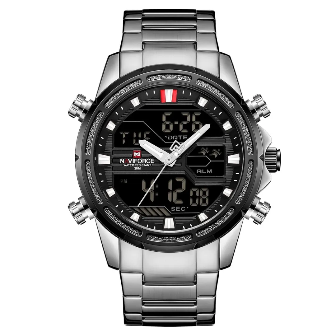 Naviforce NF9138 Luxurious Stainless Steel Men's Watch – Dial Color: Black, Strap Color: Silver – View 1