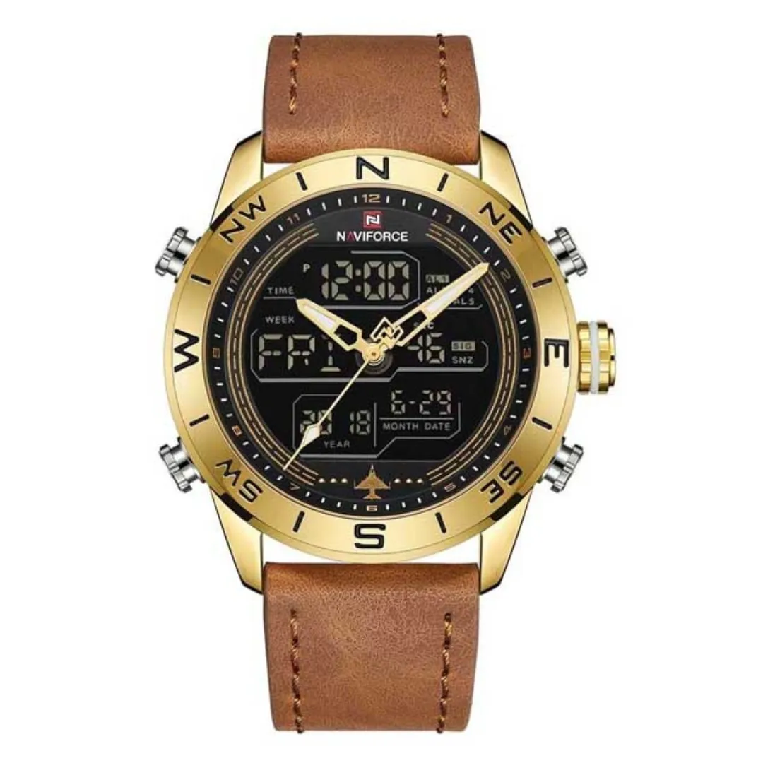 Naviforce NF9144 Luxurious Leather Waterproof Quartz Men's Watch – Dial Color: Gold, Strap Color:  Brown  – View 1