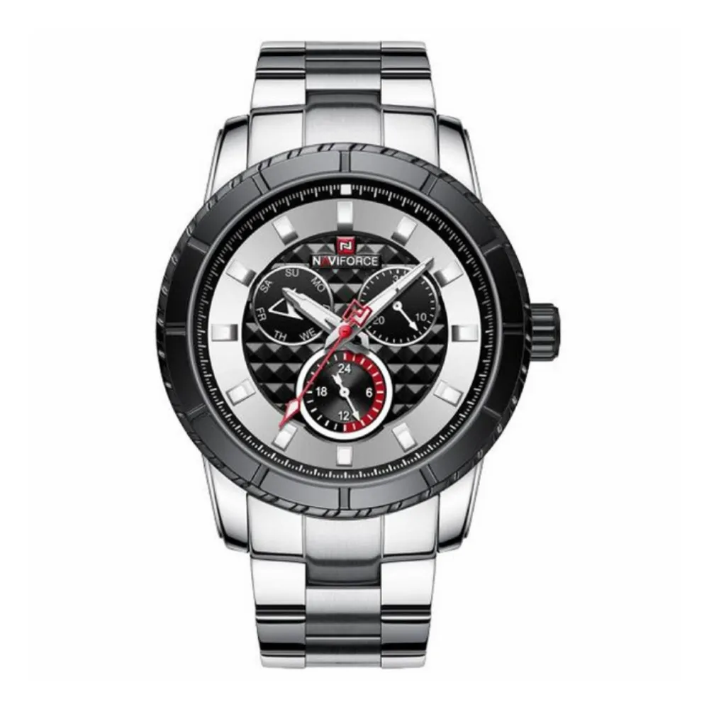 NAVIFORCE NF9145 Stainless Steel Chronograph Men’s Watch is a stylish and strong wristwatch made for men who want both fashion and function together. The design is bold with a full stainless steel body that looks premium in hand. It has a solid build so you can wear it daily without worrying about damage. The chronograph function makes it more than just a simple watch; it can show time in detail with a stopwatch-style feature. Dial is big and easy to read, with numbers and markers clear in both day and night. Glass is strong so no scratch easily, keeping the look fresh for long. Strap is stainless steel so it feels heavy in hand but also very secure, not break like a cheap band. You can wear it in the office, at a party, travel or even casual outing, it fit all place. The color and finish make it look expensive but still price stay reasonable for BD market. It also water resistant so no tension for little splash or rain. This model is good for people who want a smart look with useful features at the same time. Many young and adult men both like this type because it gives a professional and modern feel. NAVIFORCE is always known for durable watches, and NF9145 also follow the same quality promise. Once you wear it, you will feel the comfort and premium vibe on your wrist.
