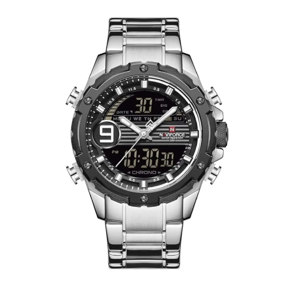 Naviforce NF9146 Double Time Waterproof Dual LCD Quartz Men's Watch  – Dial Color: Black, Strap Color: Silver – View 1