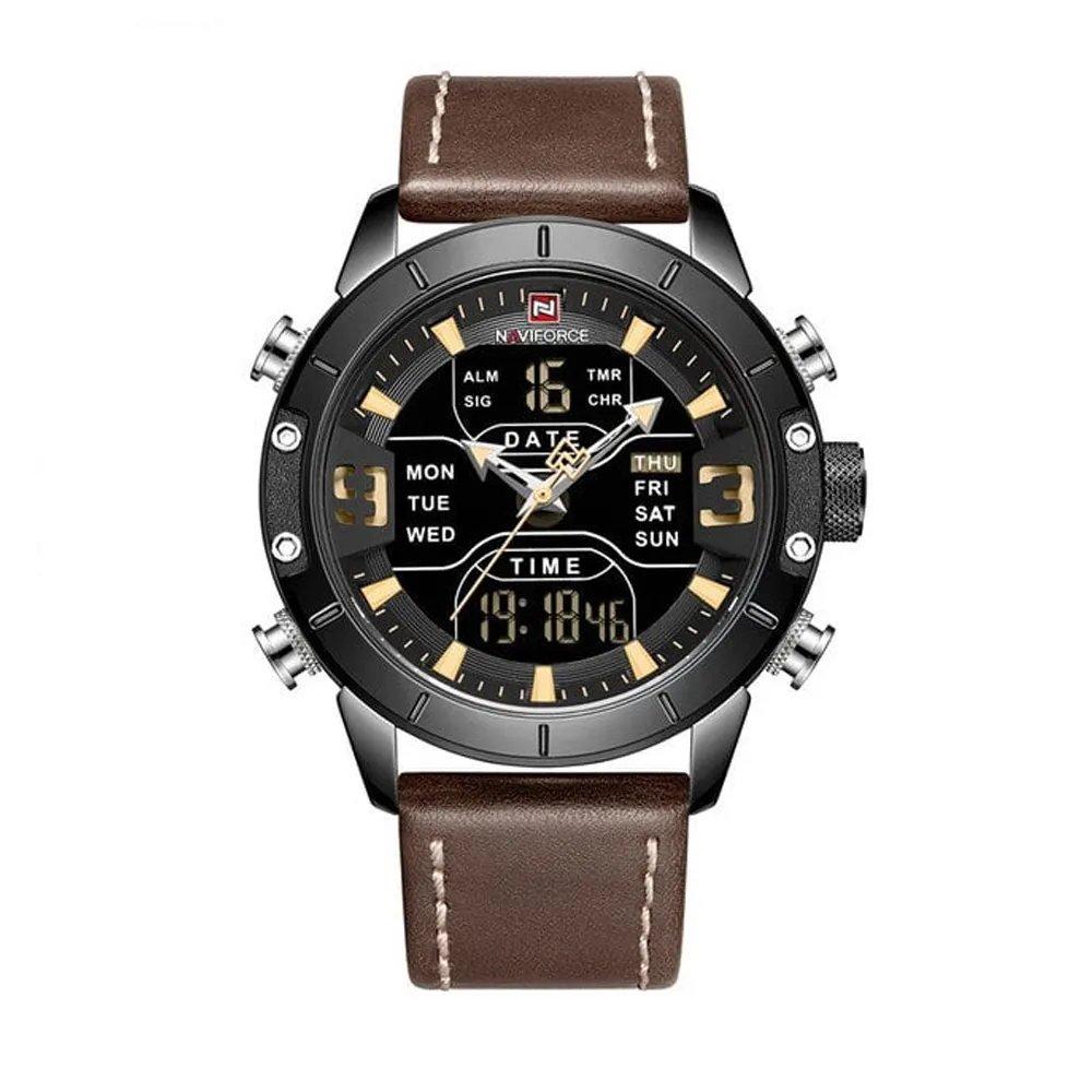 Naviforce 9153 Comfortable Genuine Leather Strap Dual Display Sport Men's Watch has both Analog and digital movement, equipped with a creative calendar display ideal for modern men who pursue vitality, individuality, classness, and Fashion. Genuine Leather Strap fashion men’s watch not only to enhance wearing comfort but also to offer bold aesthetics and hardcore temperament. The Naviforce 9153 Men's watch seamlessly transitions from casual daytime wear to elegant evening attire and is designed for the modern and stylish man. It is the perfect addition to any men's wristwatch collection.
