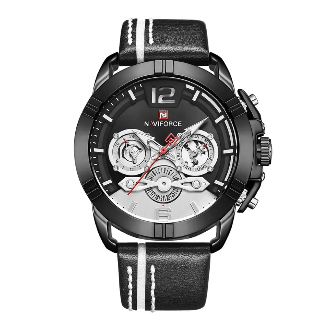 NAVIFORCE NF9168 Leather Strap Luxury Sports Men's Watch is one stylish and strong watch that mixes both a classic look and sports feel. The design looks premium with a leather strap that sits nicely on the wrist, not too heavy but feeling solid. Case is built tough so it lasts long, even if you use it daily. The dial shows clear time, with bold markers and details that stand out. Many people like it because it gives a professional look in the office but also a casual look outside. Strap is made from quality leather so it is soft and comfortable, even if you wear it for a long time. The watch also has multiple functions inside, so not only for time but also for date and other daily needs. Glass is clear and scratch resistant, so it keeps looking new even after use. It is water resistant, so no worry for small splashes or daily use. Whole build is balanced, not too big and not too small, so it matches well with most hand size. Perfect choice for men who want one watch that fit with business dress, sportswear, or normal casual life. It give you both fashion and function together. One watch that makes you look smart and also helps in daily routine.