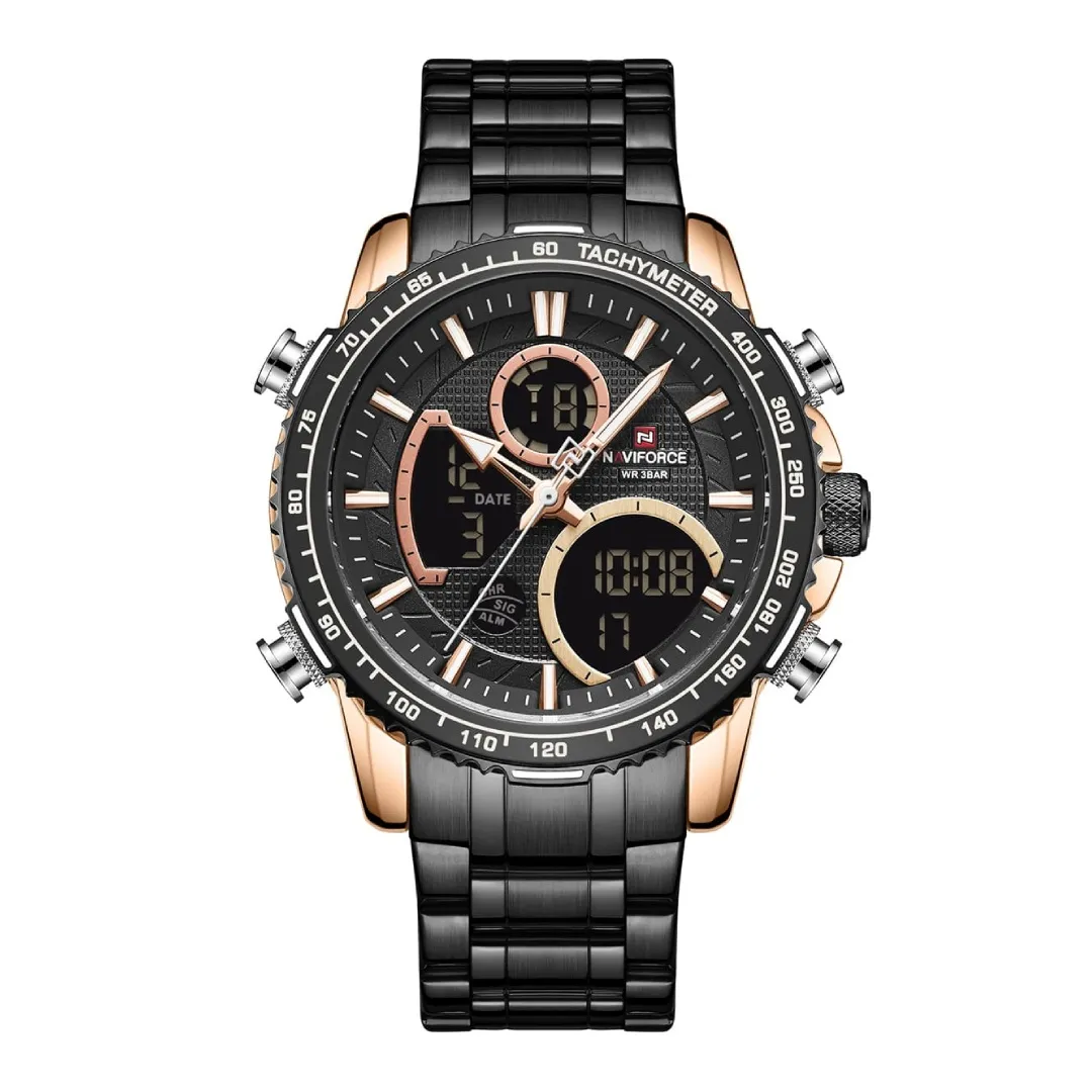 Naviforce NF9182 Luxurious Strainless Steel Chronograph Men's Watch – Dial Color: Black, Strap Color: Black – View 1