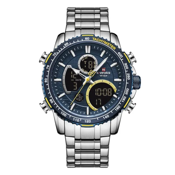 Naviforce NF9182 Luxurious Strainless Steel Chronograph Men's Watch – Dial Color: Blue, Strap Color: Silver – View 1