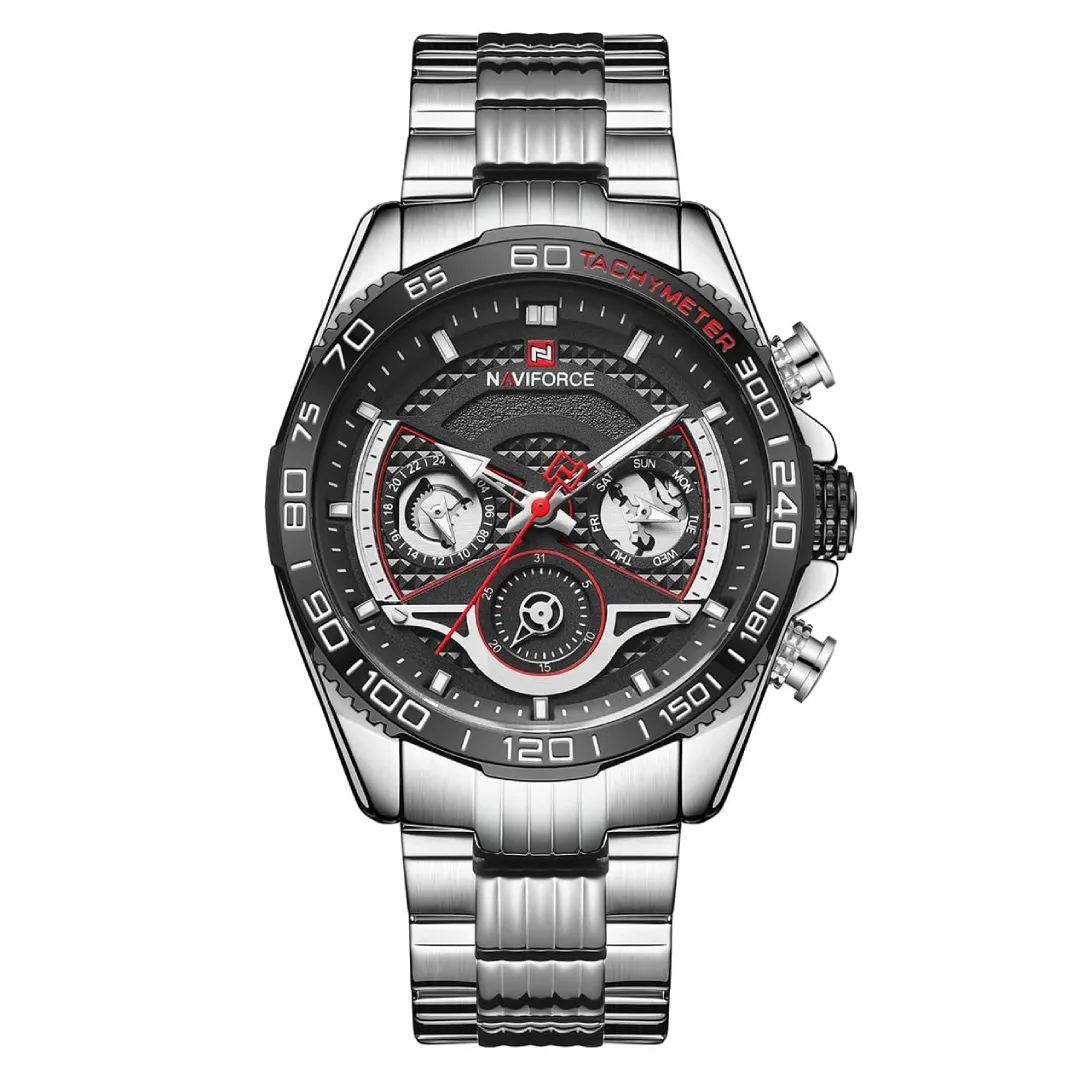NAVIFORCE NF9185 Stainless Steel Chronograph Men’s Watch is a stylish and strong watch made for men who want both fashion and daily use together. This watch body is full stainless steel, so it feels premium and also lasts a long time. The design is bold and modern, with a detailed dial that shows chronograph function and also normal time. Strap is heavy duty but still comfortable on hand, so you can wear it for long hours without feeling it. The dial is clear to see, with numbers and markers that stand out, making it good for both day and night use. It is not only a timepiece but also an accessory that gives a smart look to any dress, formal or casual. Many people choose this watch because it look expensive but is still in budget range. Chronograph function helps in timing activities and sport, while the standard display keeps daily use easy. Water resistance also make it safe for outdoor or light water contact. NAVIFORCE is always known for stylish and durable watches, and NF918 is one of their most popular models. You can use it for office, party, meeting, or just regular day, and it will always match with your style.