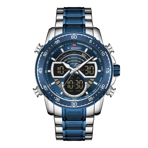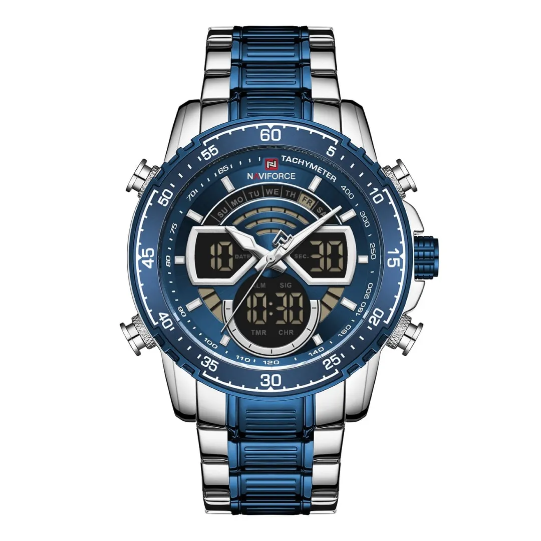 The NAVIFORCE NF9189 Men's Watch is not just a normal wristwatch; it is a perfect mix of fashion, toughness, and functionality that fit both casual and formal style. This model comes with full stainless steel body, which not only looks premium but also feels solid and durable in hand. The design gives you a bold and confident look, perfect for office wear, parties, or even daily lifestyle. One of the main highlights is the dual time display, so you can keep track of two different time zones at once, very helpful for travelers or people working with foreign clients. The analog and digital display blend together smoothly, giving a modern and classic touch in one watch. You also get features like alarm, stopwatch, LED backlight, and calendar, so it is not just about time but about full daily support. The watch glass is hardened mineral crystal, strong enough to resist scratches and keep the dial clear. With 30M water resistance, you don’t have to worry about splashes, rain, or daily water use. The strap is stainless steel too, giving firm grip on wrist and making sure it lasts long without losing shine. Overall, this is a watch made for men who want to balance style, power, and utility in one single timepiece.
