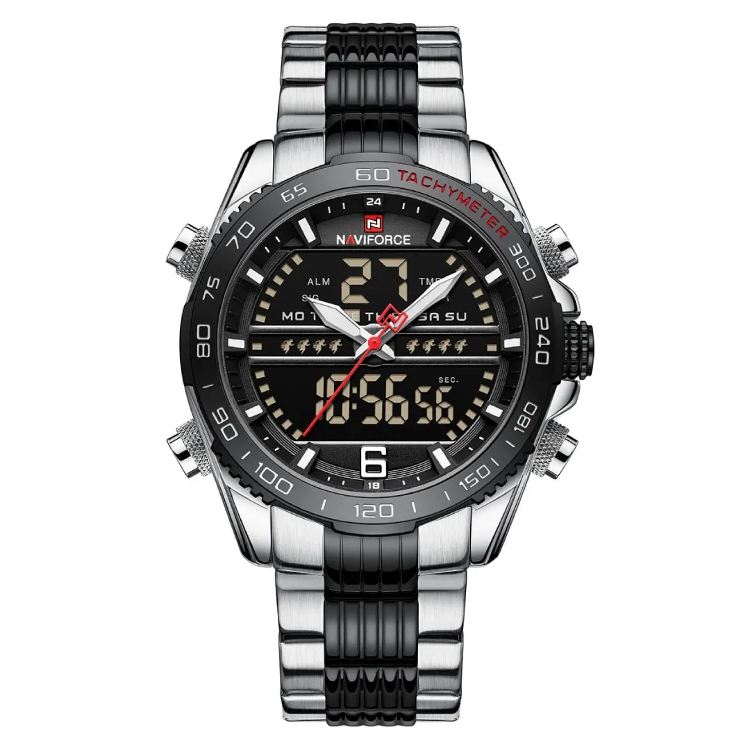 NAVIFORCE NF9195 Stainless Steel Dual Time Men's Watch – Dial Color: Black, Strap Color: Silver – View 1