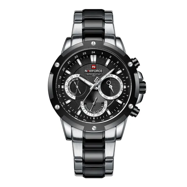 NAVIFORCE NF9196 Silver Stainless Steel Chronograph Men's Watch – Dial Color: Black, Strap Color: Silver – View 1