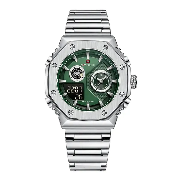 NAVIFORCE NF9216S Dual Time Display Analog Quartz Man's Watch – Dial Color: Green, Strap Color: Silver – View 1