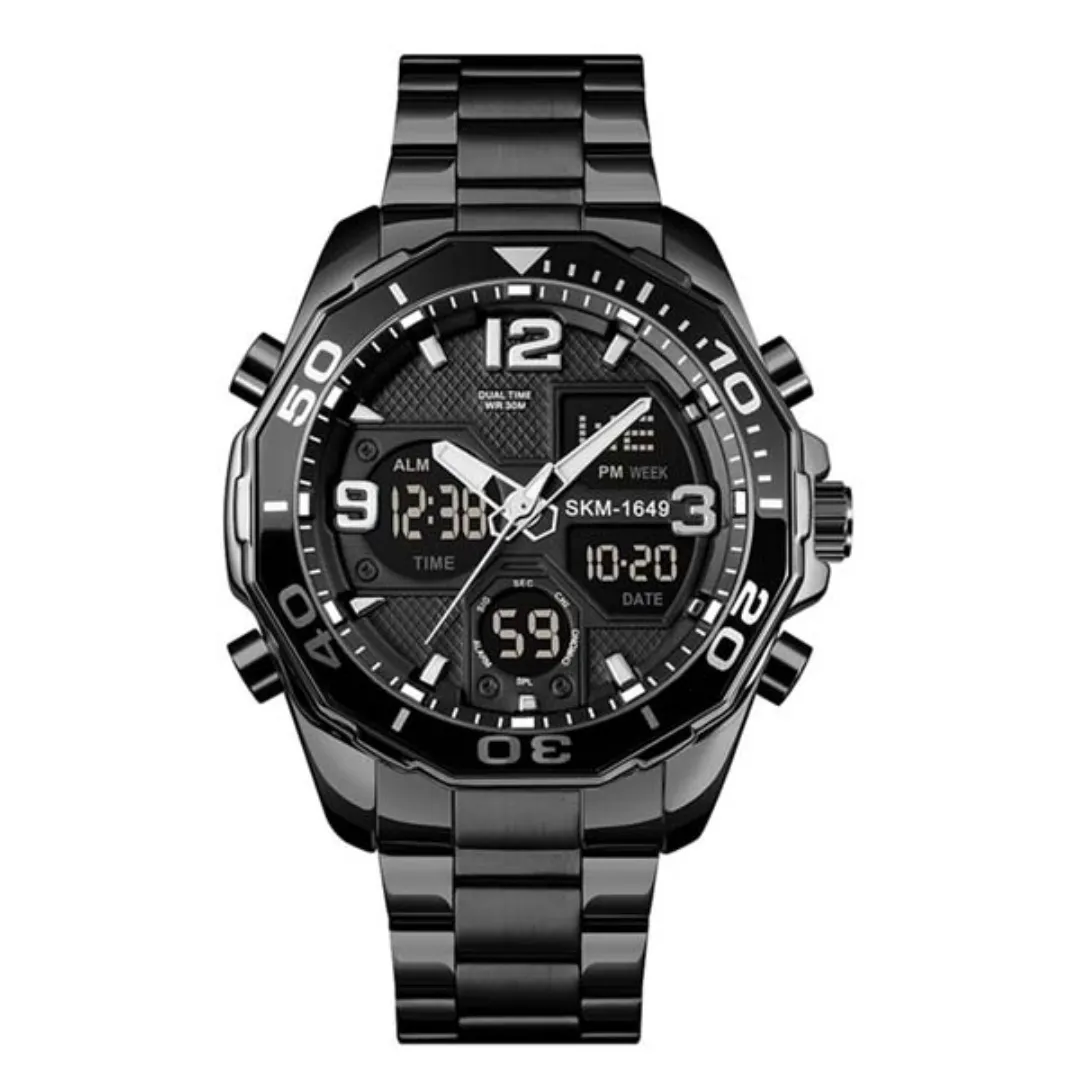 If you want a watch that gives both a modern digital look and a classic analog style in one piece, then Skmei 1649BK Men's Watch is perfect choice. This watch is made with stainless steel body, so it feel solid and premium on wrist. The design is bold, but also clean enough to wear in office, party, or even casual outing. With dual display system, you can check time in both analog hands and digital numbers, so never miss detail. The LED backlight make it easy to see time in dark or low light, which is useful at night or during travel. Strap is also stainless steel, polished but not too flashy, giving balance of style and durability. It’s not just a fashion piece, but also strong for daily use because of its build quality. The case is designed to resist scratch and keep shine for long time, while the glass cover give clear view inside. Skmei design team focus on making this model both stylish and practical, so it match with formal dress, sportswear, or even smart casual outfit. If you want a watch that last long, look classy, and give multifunction feature, Skmei 1649BK is definitely a watch worth buying.