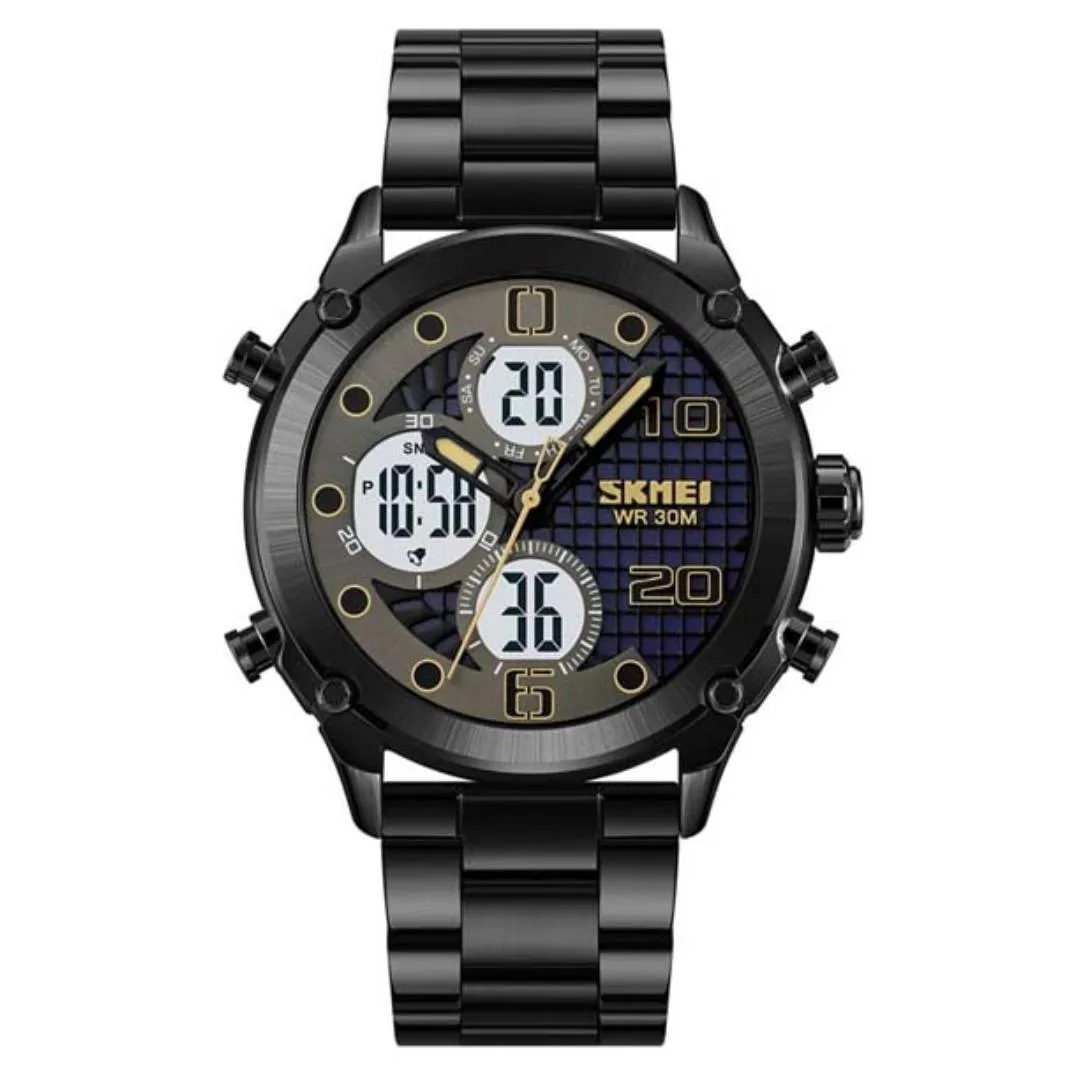 SKMEI 1975 Men's Watch is a stylish watch made for men who like classic look with modern touch. The body made from stainless steel, so it look shiny and premium when wear in hand. This watch give both digital and analog time, so you get double benefit in one piece. The analog part give you traditional hand style, while the digital screen show clear number for easy reading. Many people like this type of design because it mix fashion with smart use. You can wear it for office, meeting, or even casual time, and it match with suit or normal shirt both. The strap made strong but also comfortable, so you can wear whole day without problem. The glass is clear and protect from scratches in normal daily use. It also have backlight option, so you can see time in dark place. Water resistance is also there, so light rain or splash not harm the watch. Overall it give elegant look, durable build, and useful features all together in one stylish model for men who want value in budget.
