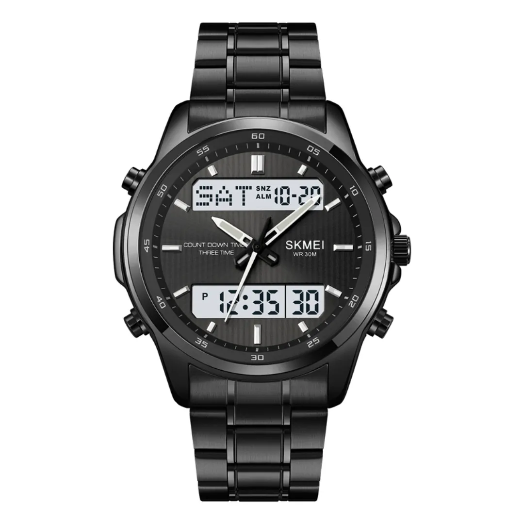 Skmei 2049 Analog Digital Dual Display Men’s Watch is a stylish and useful timepiece made for men who want both fashion and function together. This watch show you the time in both analog and digital display, so you get double option in one piece. The body design is modern, strong and give a sporty look that match with casual or outdoor outfit. Strap is made with durable material that feel light and comfortable on wrist, so you can wear whole day without problem. The dial is clear and easy to read, numbers and details show nicely even in low light. Digital screen also give you extra function like alarm, stopwatch and calendar, so it becomes not only a watch but also daily life tool. Water resistance give you safety when you go in rain or wash hand, so you not worry for small splash. Battery inside is long lasting, keep your time running without quick change. This watch is perfect choice for student, young people, office man or anyone who want a multipurpose watch in a budget. Whether you wear it for work, sport or travel, the Skmei 2049 give you both smart look and reliable performance.