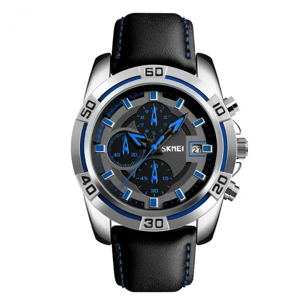 Skmei 9156 Fashion Leather Luxury Military Quartz Men's Watch  – Dial Color: Blue, Strap Color: Black – View 1