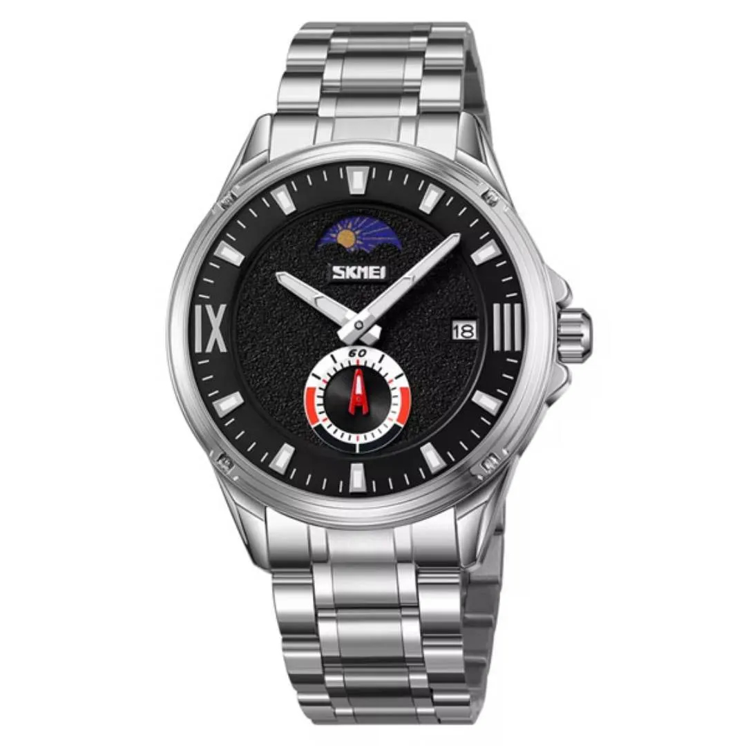 SKMEI 9326 Quartz Stainless Steel Analog Moon Phase Men's Watch – Dial Color: Black, Strap Color: Silver – View 1
