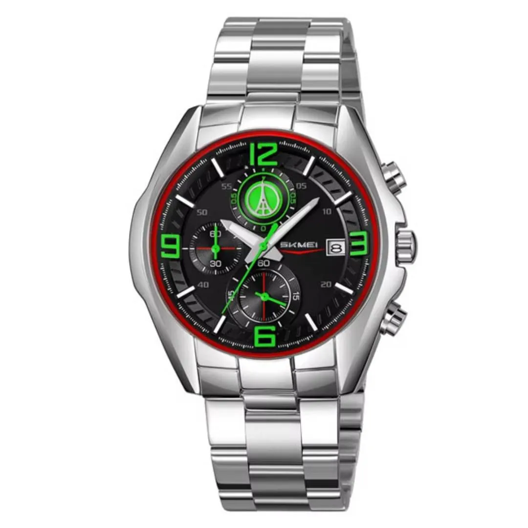 Skmei 9346 Multifunctional Quartz Men's Watch – Dial Color: Green, Strap Color: Silver – View 1